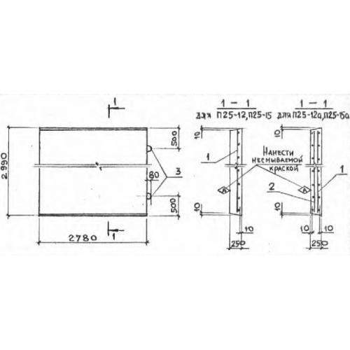 Плиты перекрытия лотков П 25-15 а имеют габаритные размеры 2990х2780х250 , где: указывается длина, ширина и высота, а также порядковый номер размерной группы, расчетная нагрузка. Геометрический объем данного изделия составляет 2,0781 , объем бетона - 2,08 . Общий вес изделия 5200 . Все обозначения наносят специальной краской на боковую грань плиты.